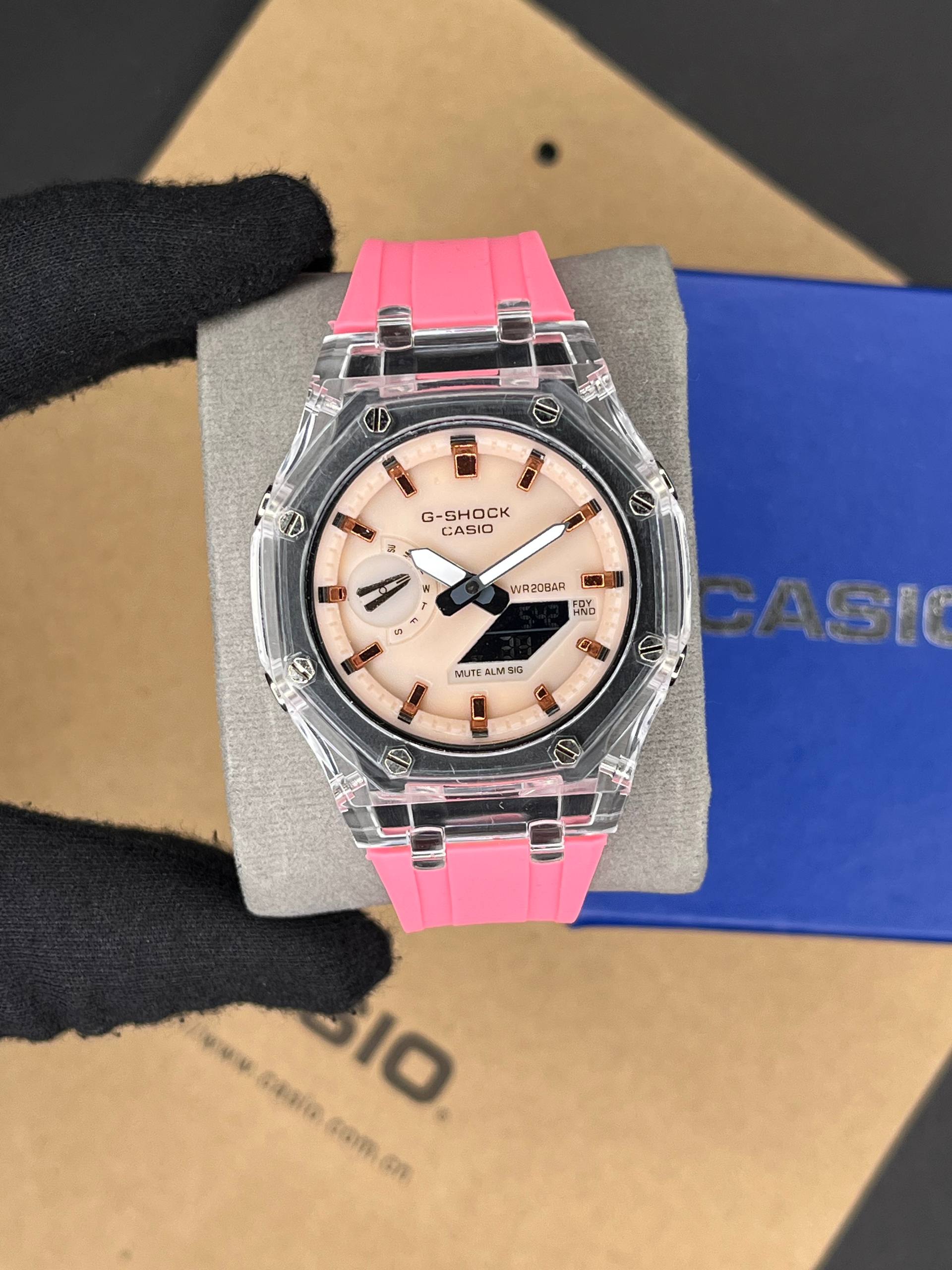 ساعت جیشاک 2100 قاب شیشه ای پمپی-صورتی کرم