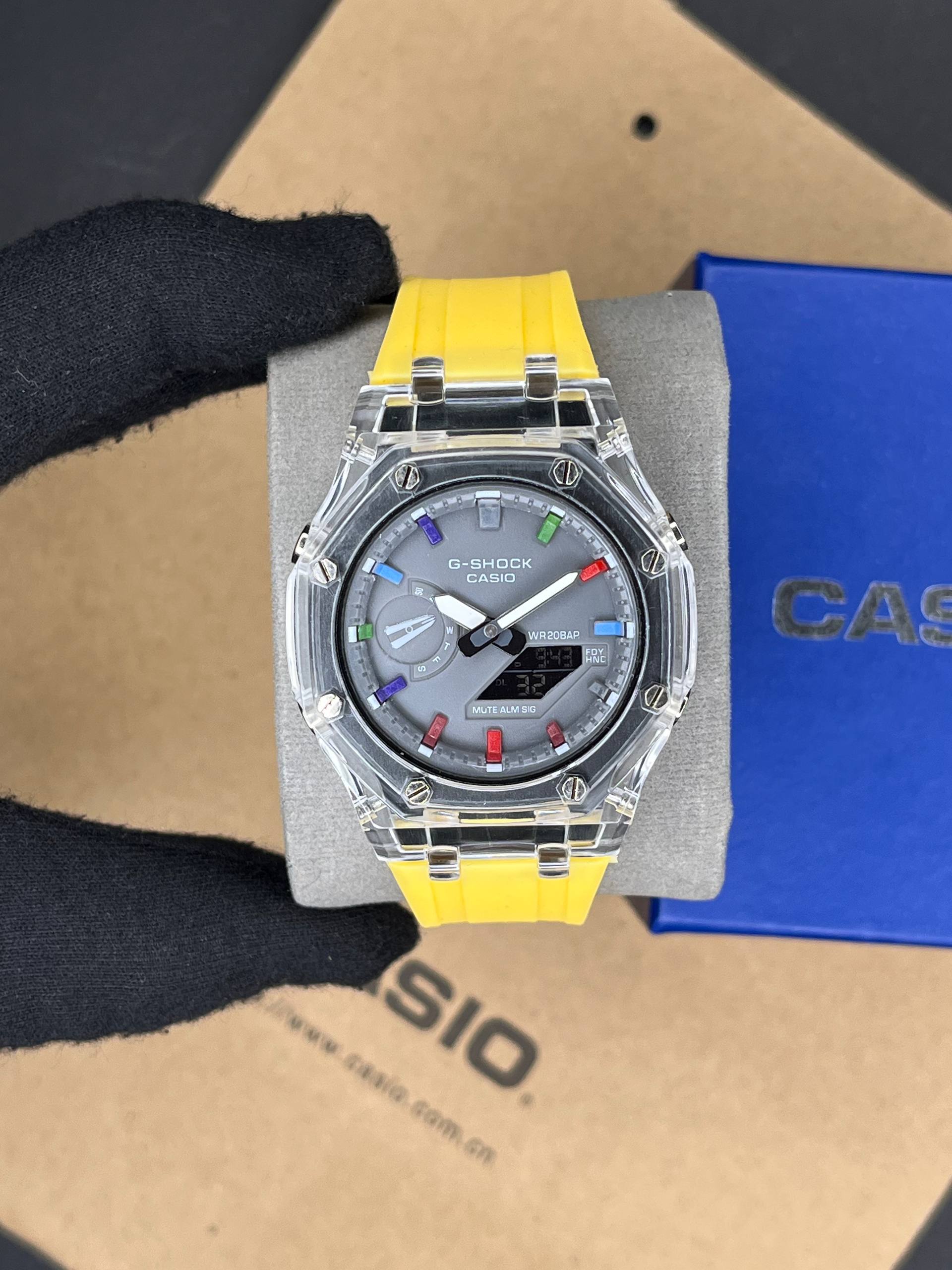 ساعت جیشاک 2100 قاب شیشه ای پمپی- زرد هفت رنگ