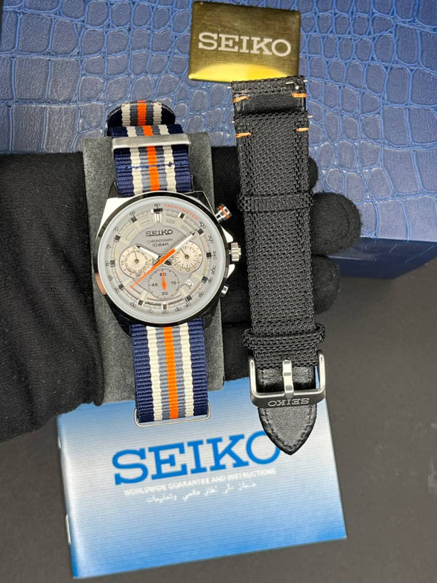 ساعت مچی مردانه سیکو 3موتور فعال مدل SSB409P1 نارنجی بند برزنتی و بند اضافه