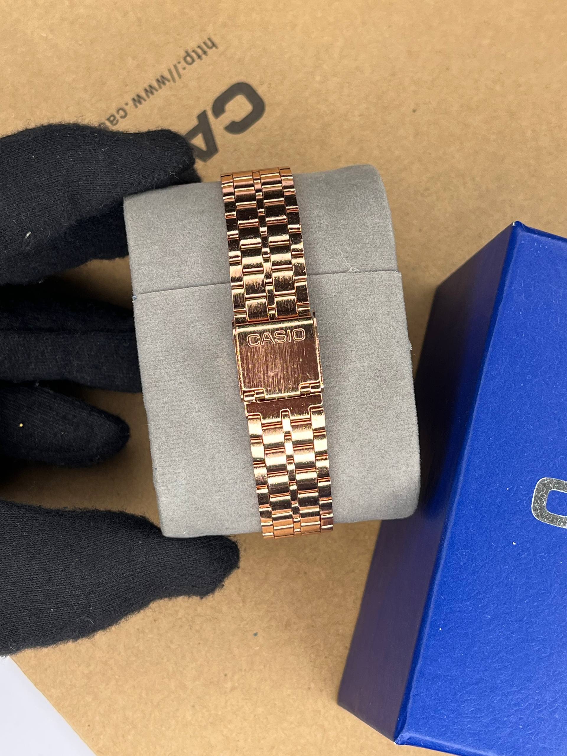 نوع ساعت: ساعت کلاسیک کاسیو گادفادر تقویم: فعال رنگ: رزگلد صفحه بنفش جنس بدنه: استیل ضد آب: در حد پاشش آب نوع قفل: بند باز فشاری نوع بند: کرکره ای